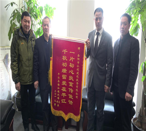 1月22日,平江縣梅仙鎮(zhèn)玳璋村幫扶對象,將一面寫著"一片初心扶貧傳佳話,千秋功績留愛在平江"18個大字的鮮紅錦旗送到市水建投董事長劉寶山、總經理楊雄輝的手中,對市水建投對精準扶貧工作的大力支持表達誠摯謝意。